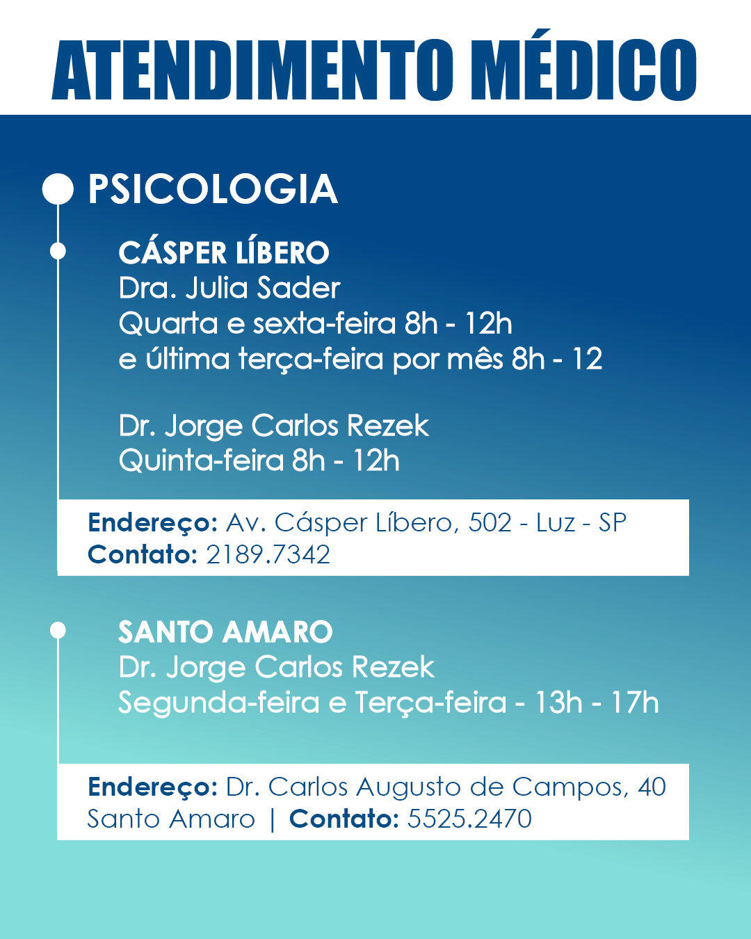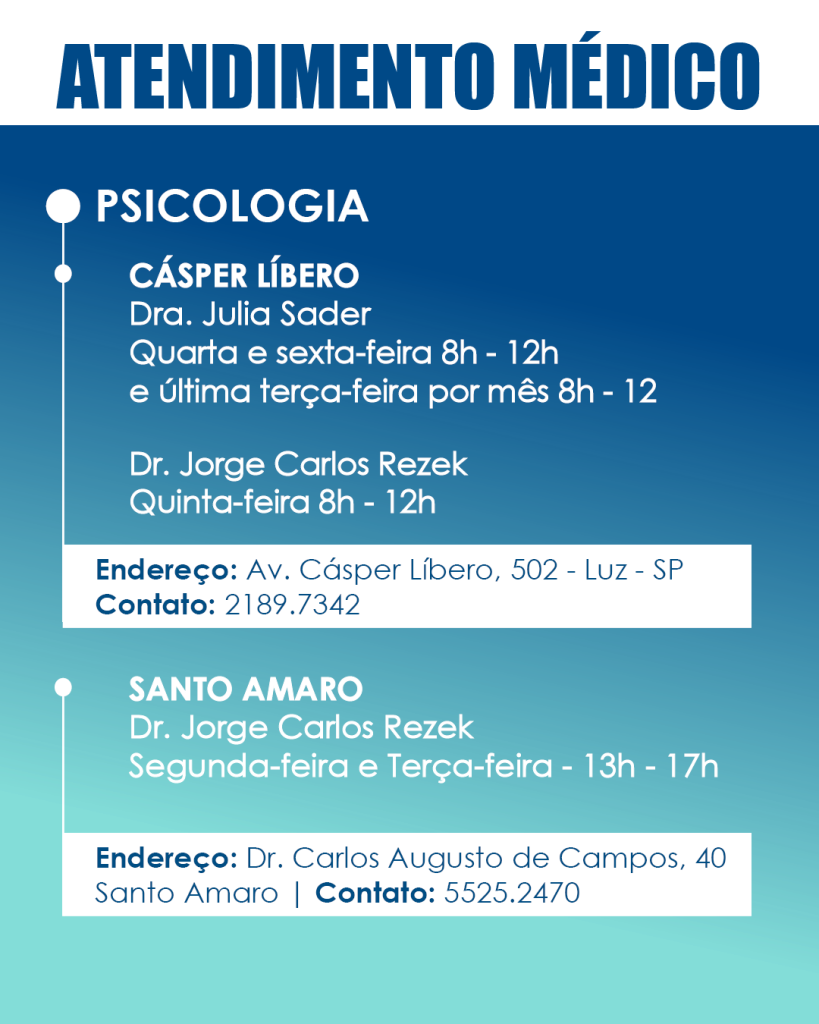 Dra. Julia Sader — quartas e sextas, 8h–12h; última terça do mês, 8h–12h