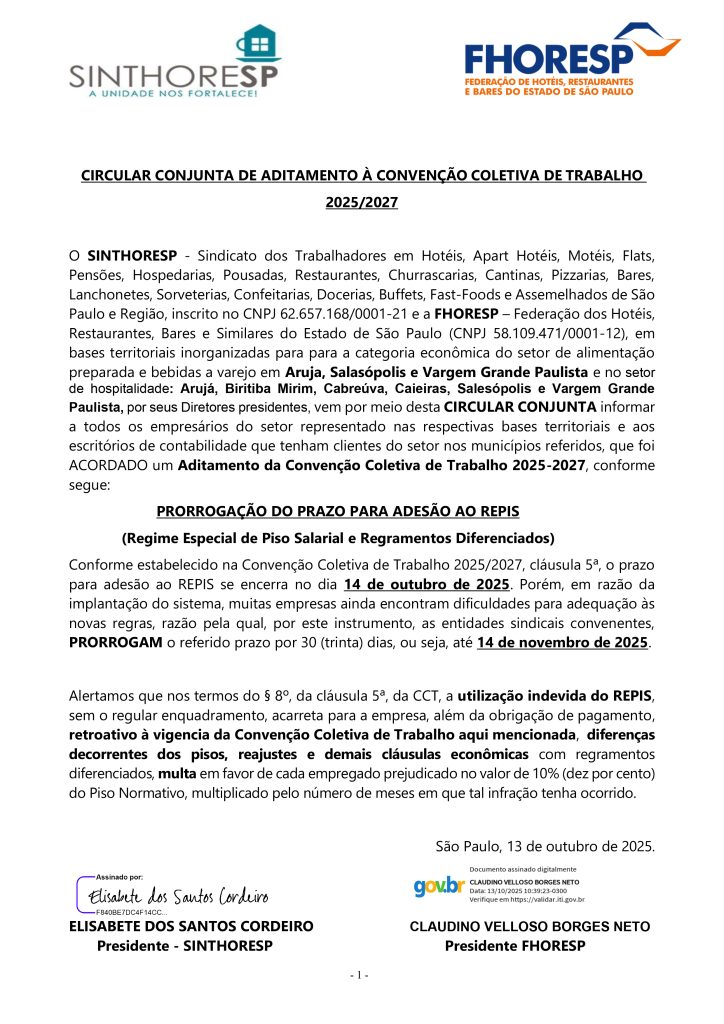 A circular foi assinada por Elisabete dos Santos Cordeiro, Presidente do SINTHORESP , e Claudino Velloso Borges Neto, Presidente da FHORESP , em 13 de outubro de 2025.