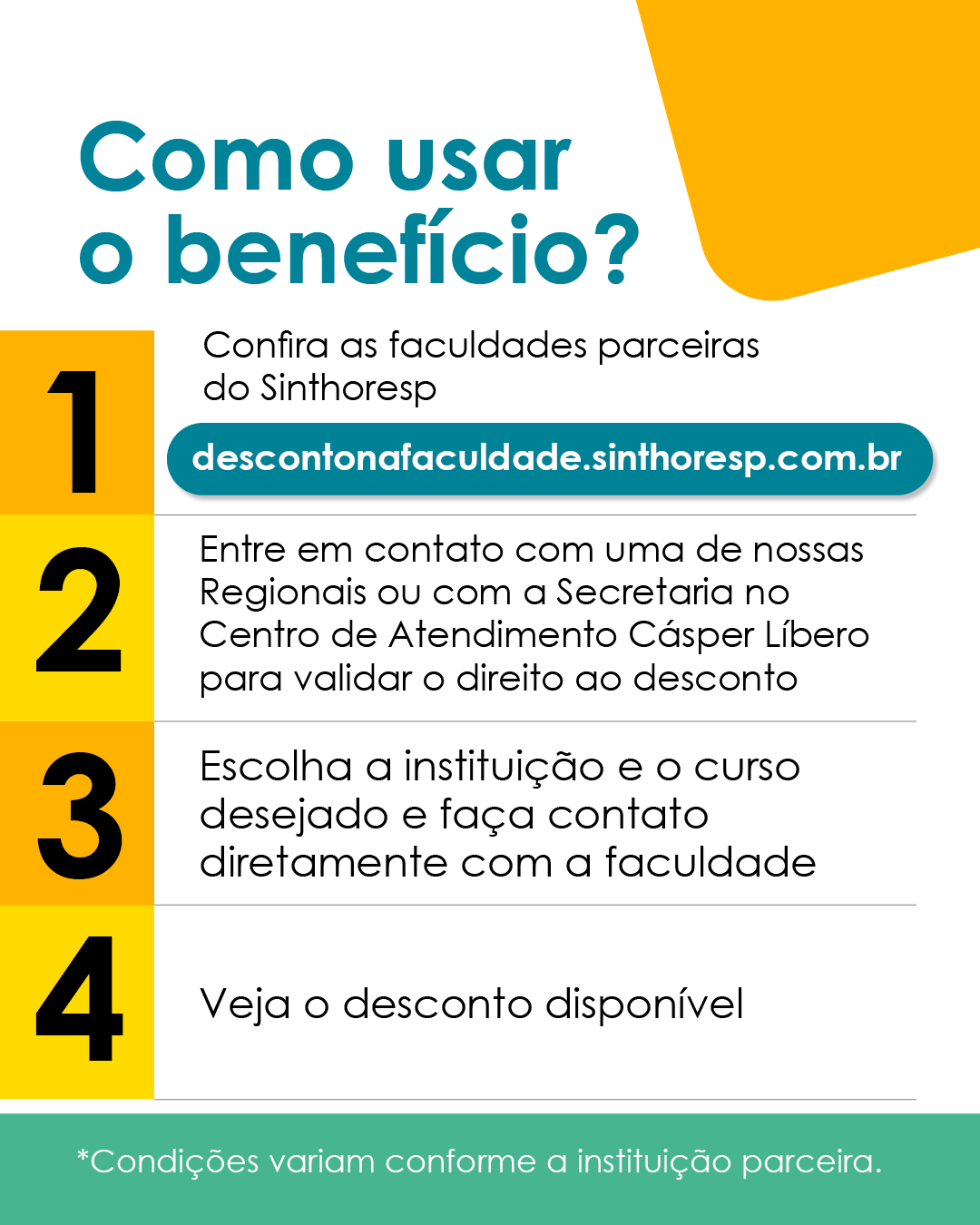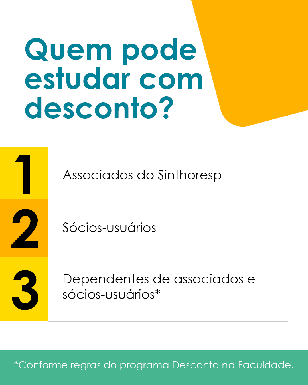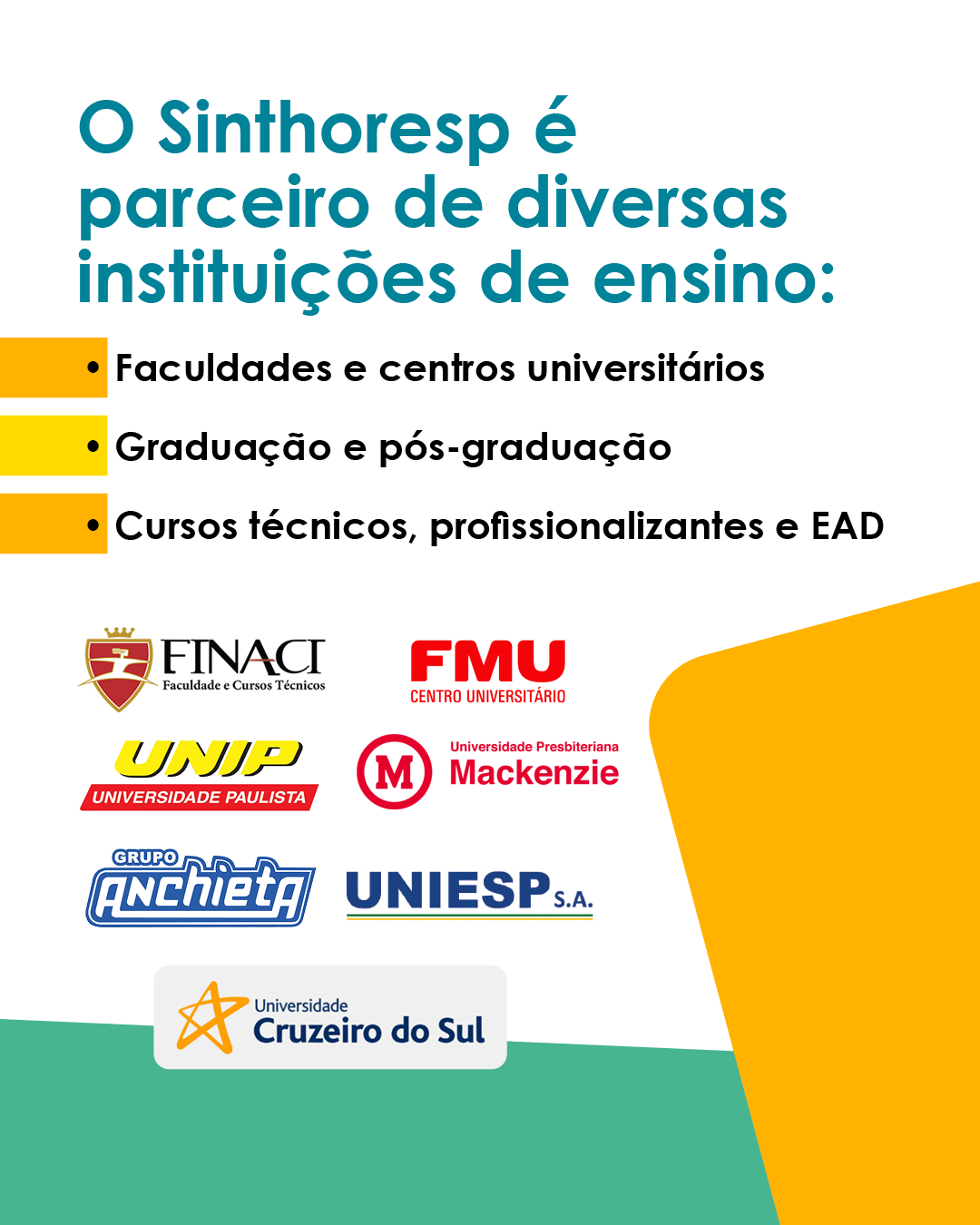 O Sinthoresp mantém parceria de benefícios educacionais que reúne diversas instituições de ensino superior e cursos livres com condições especiais para a categoria. Por meio do programa Desconto em Faculdade, associados, sócios-usuários e seus dependentes podem garantir descontos exclusivos nas mensalidades em cursos de graduação, pós-graduação, técnicos, profissionalizantes e EAD.