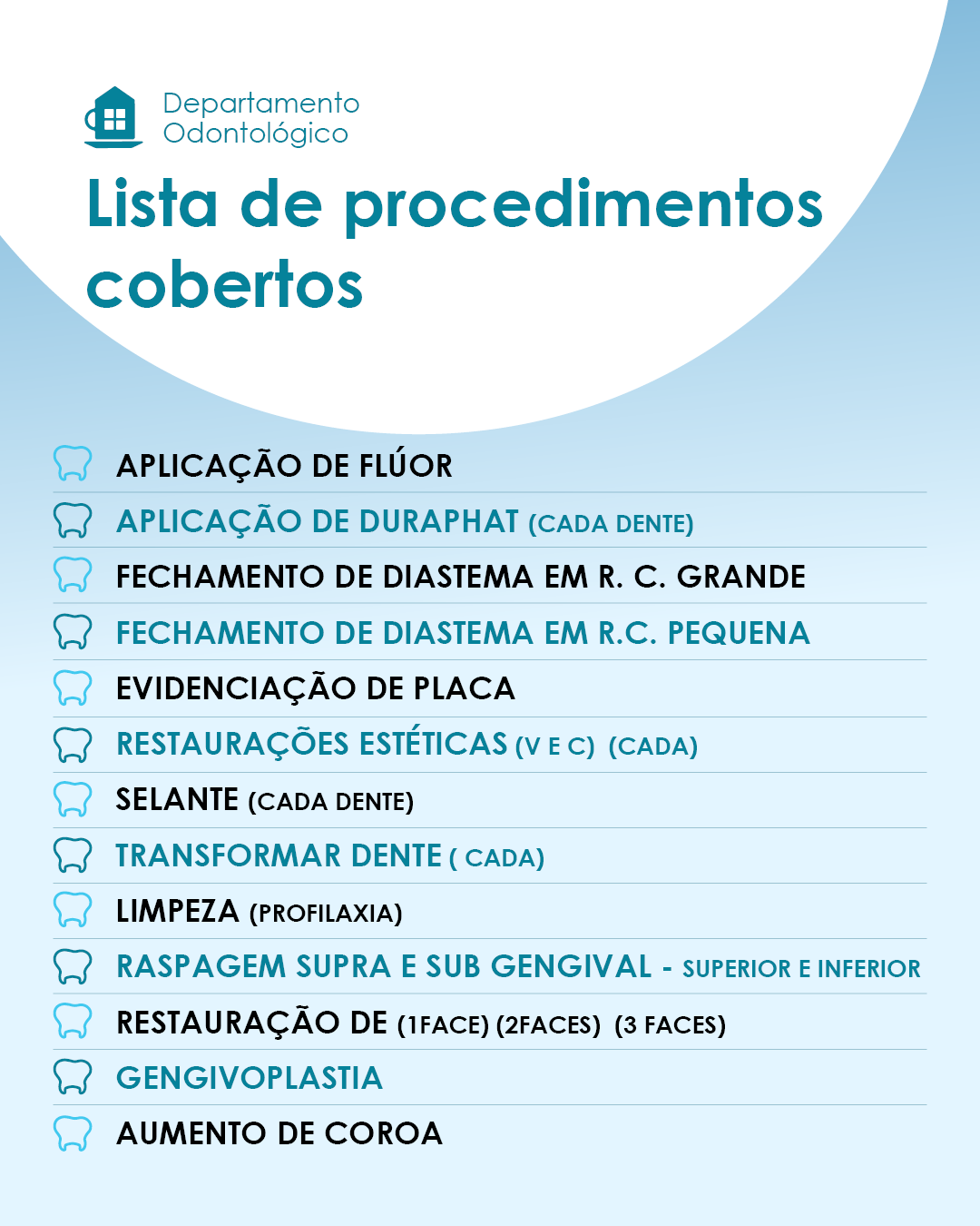 Entre os procedimentos cobertos em Dentística, estão: limpeza (profilaxia), restaurações estéticas em resina composta, aplicação de flúor, selantes, evidenciação de placa bacteriana, raspagem supra e subgengival, fechamento de diastema em resina composta, gengivoplastia, aumento de coroa e transformação de dente.