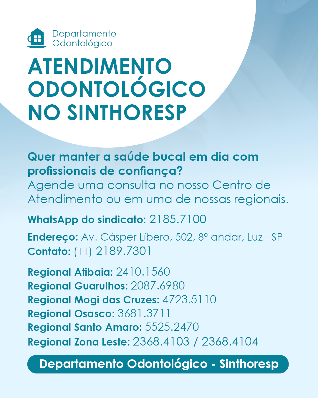 Dessa forma, o Sinthoresp reafirma seu compromisso em oferecer um cuidado odontológico completo, acessível e de excelência, voltado à saúde e ao bem-estar da categoria. Agende sua consulta e compareça ao Departamento Odontológico para cuidar do seu sorriso com a atenção que você merece.