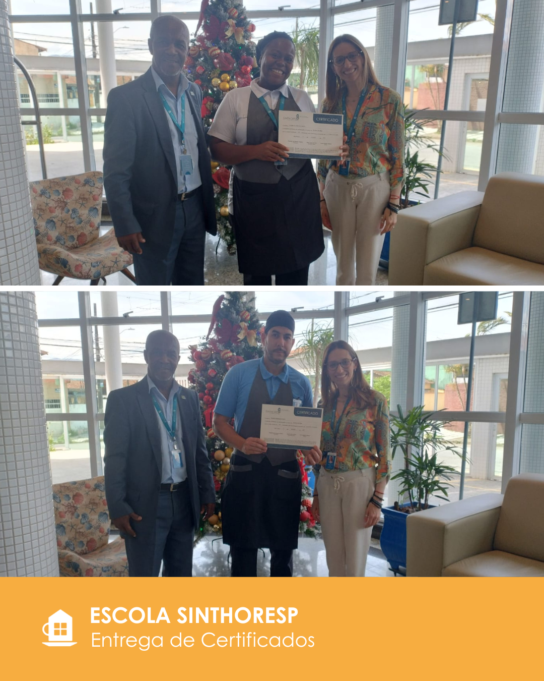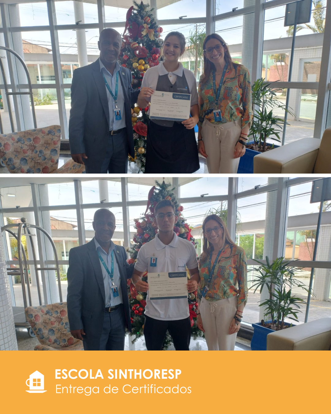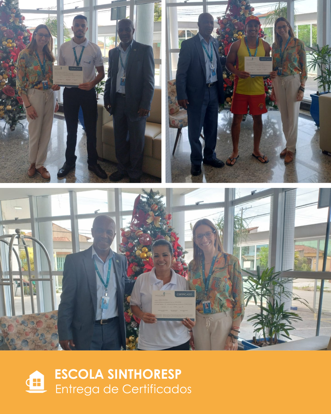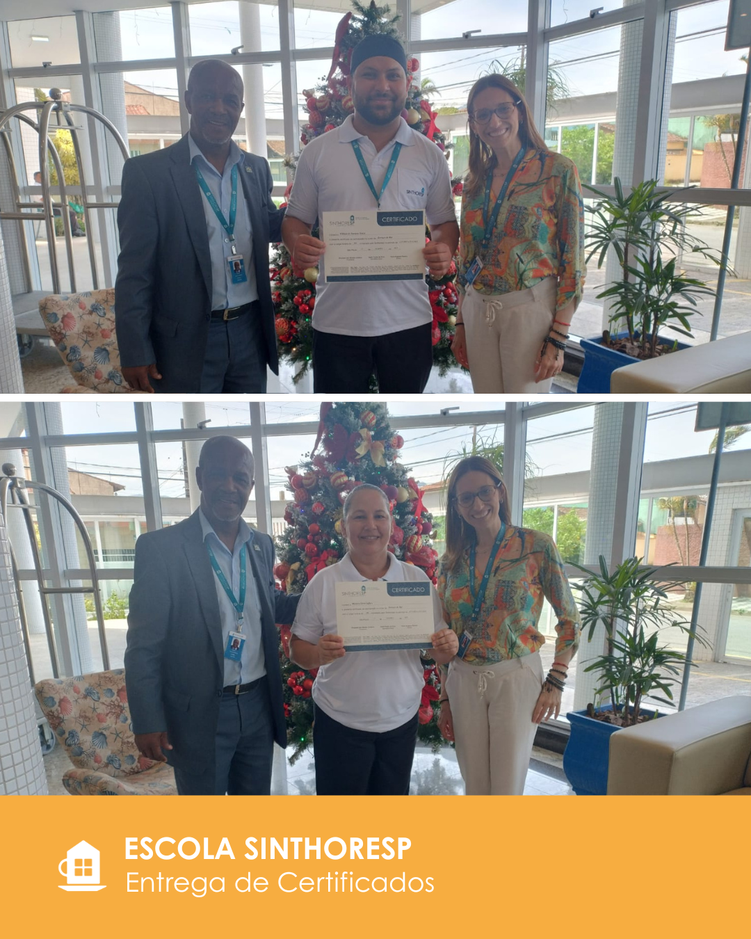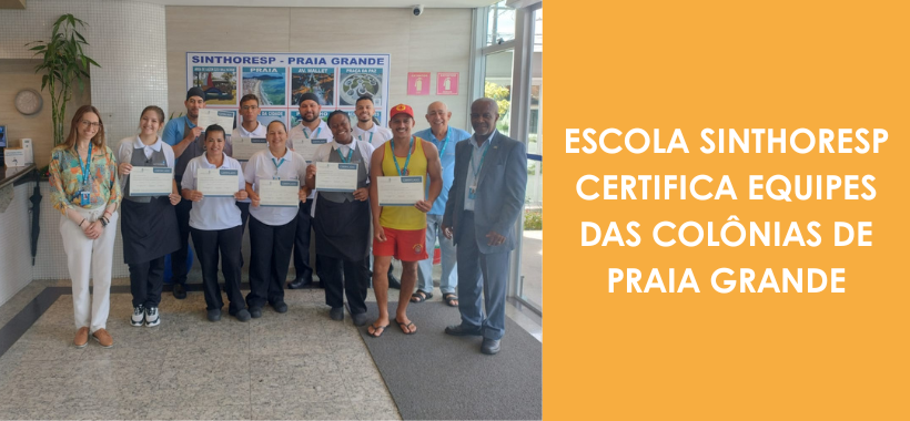 A Escola Sinthoresp realizou a entrega de certificados aos trabalhadores das colônias de férias Nova Mirim e Maracanã, em Praia Grande, que participaram do treinamento interno em atendimento e serviço de coquetéis. A entrega foi conduzida pelo diretor da Escola, Paulo Pereira, e pela coordenadora Andressa Santos. A ação integra a estratégia do sindicato de padronizar o atendimento aos associados e hóspedes e organizar os serviços de bar nas unidades próprias.