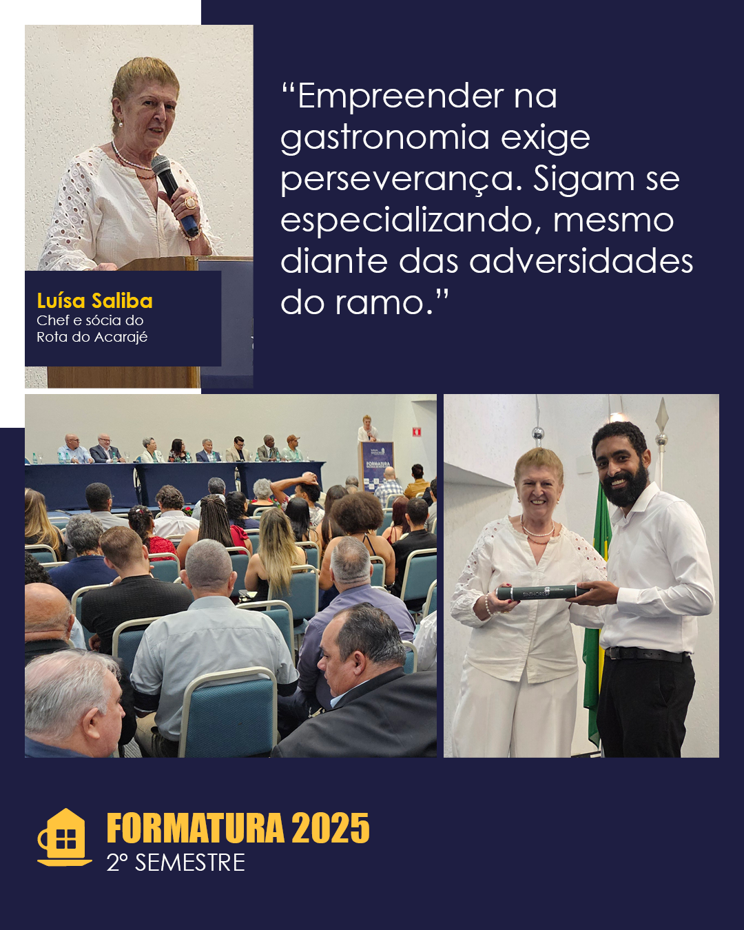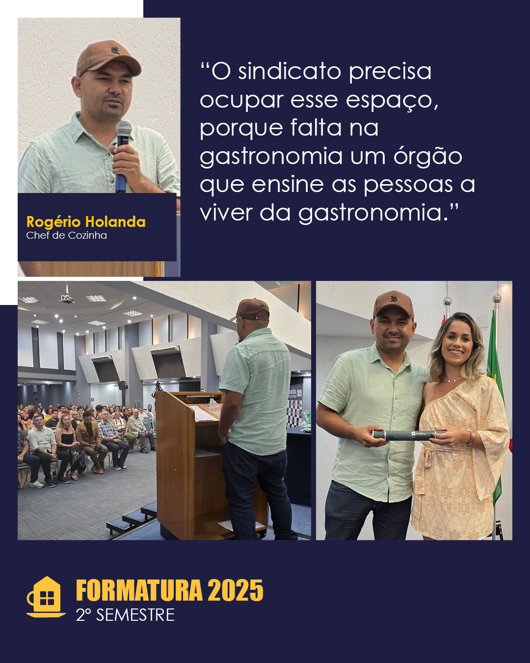 A chef Luísa Saliba mencionou sua trajetória como empreendedora à frente do restaurante Rota do Acarajé e incentivou os alunos a perseverarem na profissão. Já Rafael Guerra, representante da SEIU América Latina, parabenizou os formandos e destacou o impacto da formação na trajetória dos trabalhadores do setor, ao relacionar o acesso a cursos e à informação sobre direitos a mais oportunidades e valorização no trabalho.