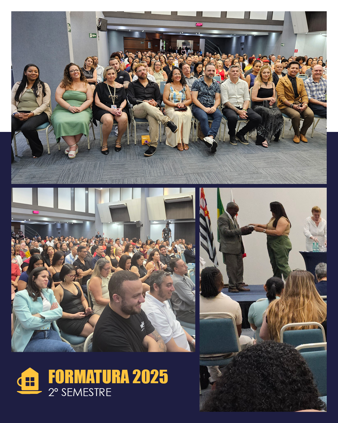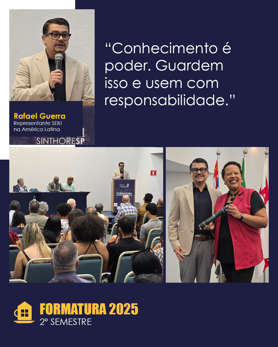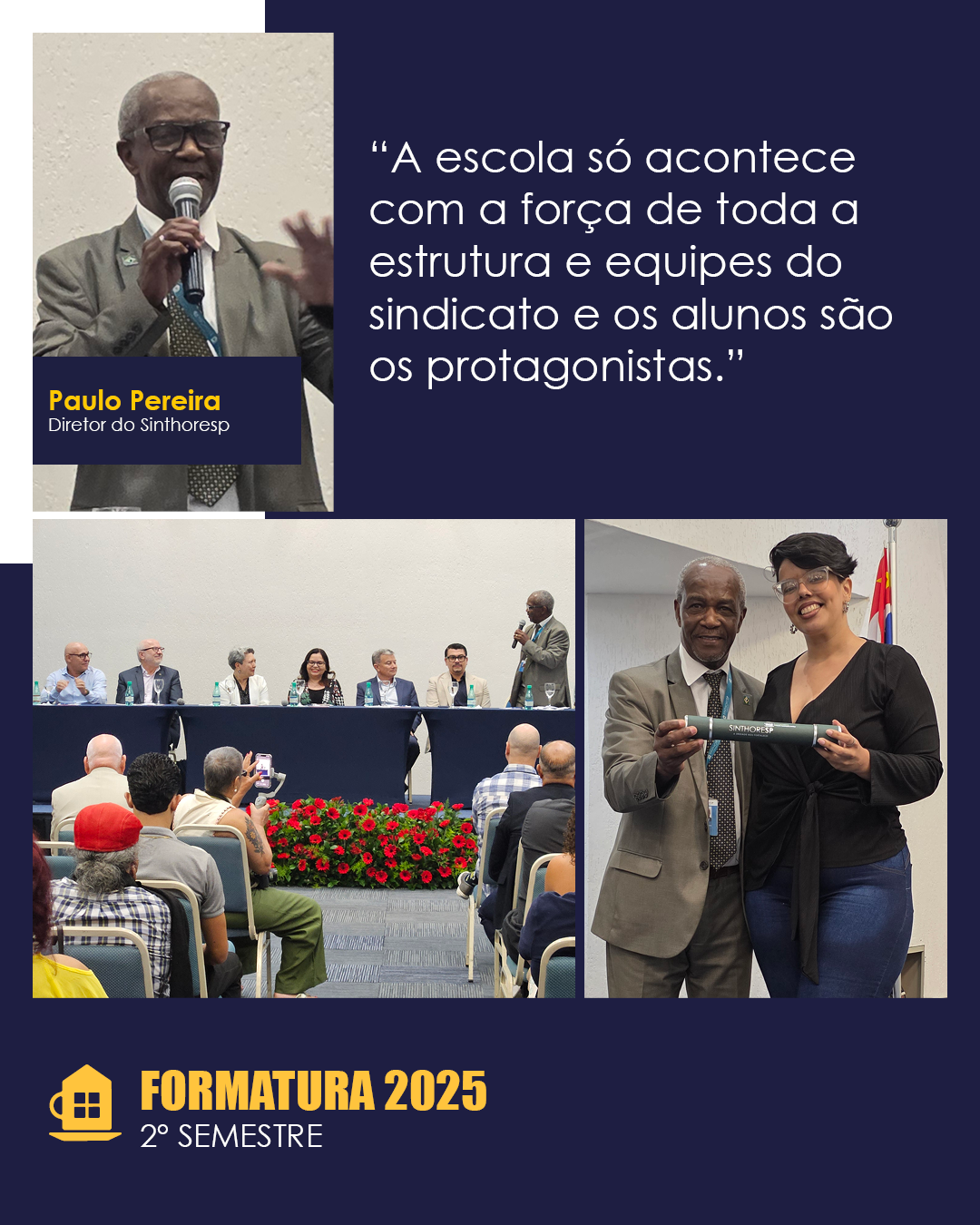 Na terça-feira, 16 de dezembro de 2025, a Escola Sinthoresp realizou a cerimônia de formatura dos cursos livres profissionalizantes ministrados no 2º semestre de 2025, com turmas da Sede Taguá e da Regional Osasco. O evento aconteceu no Auditório Francisco Calasans e foi conduzido por Andressa Santos, coordenadora da Escola, reunindo formandos, familiares, docentes, convidados e representantes da entidade.