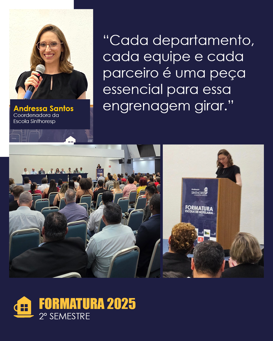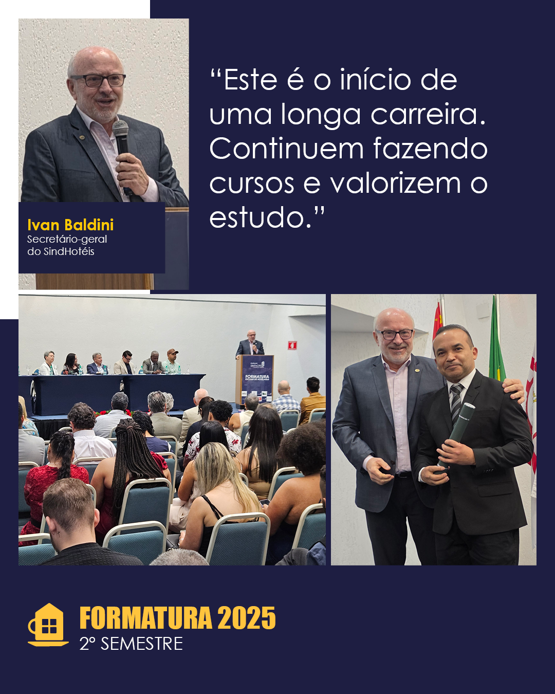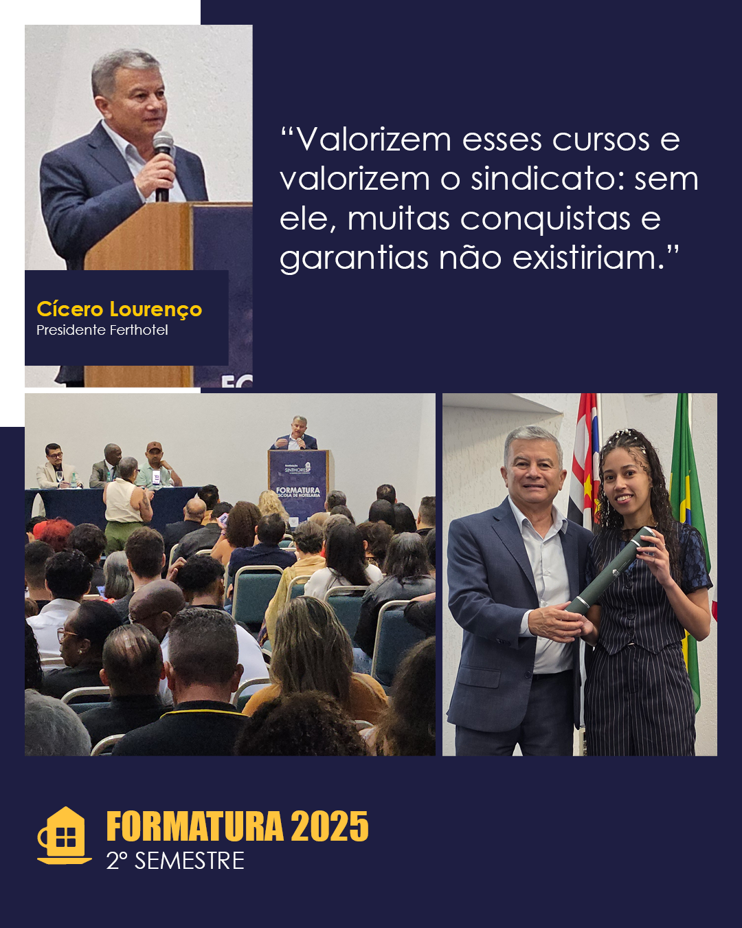 O presidente da Fetrhotel, Cicero Lourenço, reforçou a importância da formação diante do cenário de escassez de mão de obra no setor em todo o país e ressaltou o papel do sindicato na garantia de direitos e na oferta de cursos gratuitos. Ivan Baldini, secretário-geral do SindHotéis, estimulou a continuidade dos estudos como parte de uma trajetória de longo prazo na hotelaria e na gastronomia.
