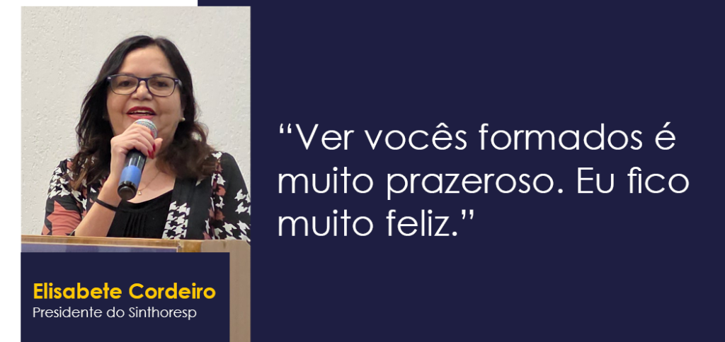 Encerrando as falas da mesa, a presidente Elisabete dos Santos Cordeiro ressaltou que acompanhar a formatura das turmas é motivo de satisfação e reforçou a importância do vínculo permanente com o sindicato. Ela também citou a estrutura de serviços oferecida aos trabalhadores e a diversidade de cursos disponíveis.