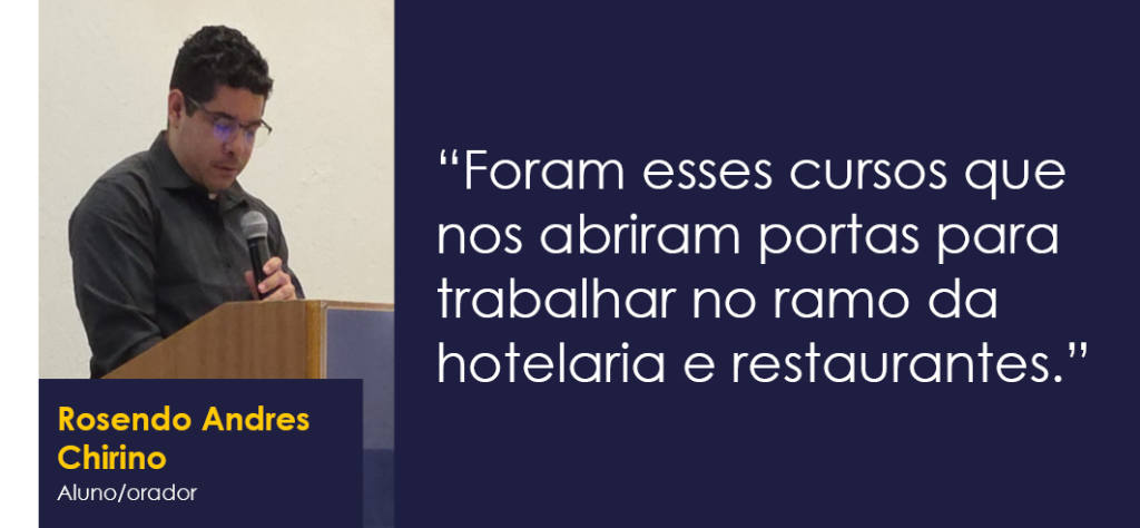 Orador da turma, o aluno Rosendo Andres Chirino relatou a trajetória da família desde a chegada ao Brasil, em 2018, e associou os cursos ao processo de inserção profissional. Ele destacou que foram essas formações que abriram portas para o trabalho na hotelaria e na área de restaurantes e ressaltou que a convivência com professores e colegas contribuiu para o desenvolvimento de talentos e para o crescimento profissional e pessoal.