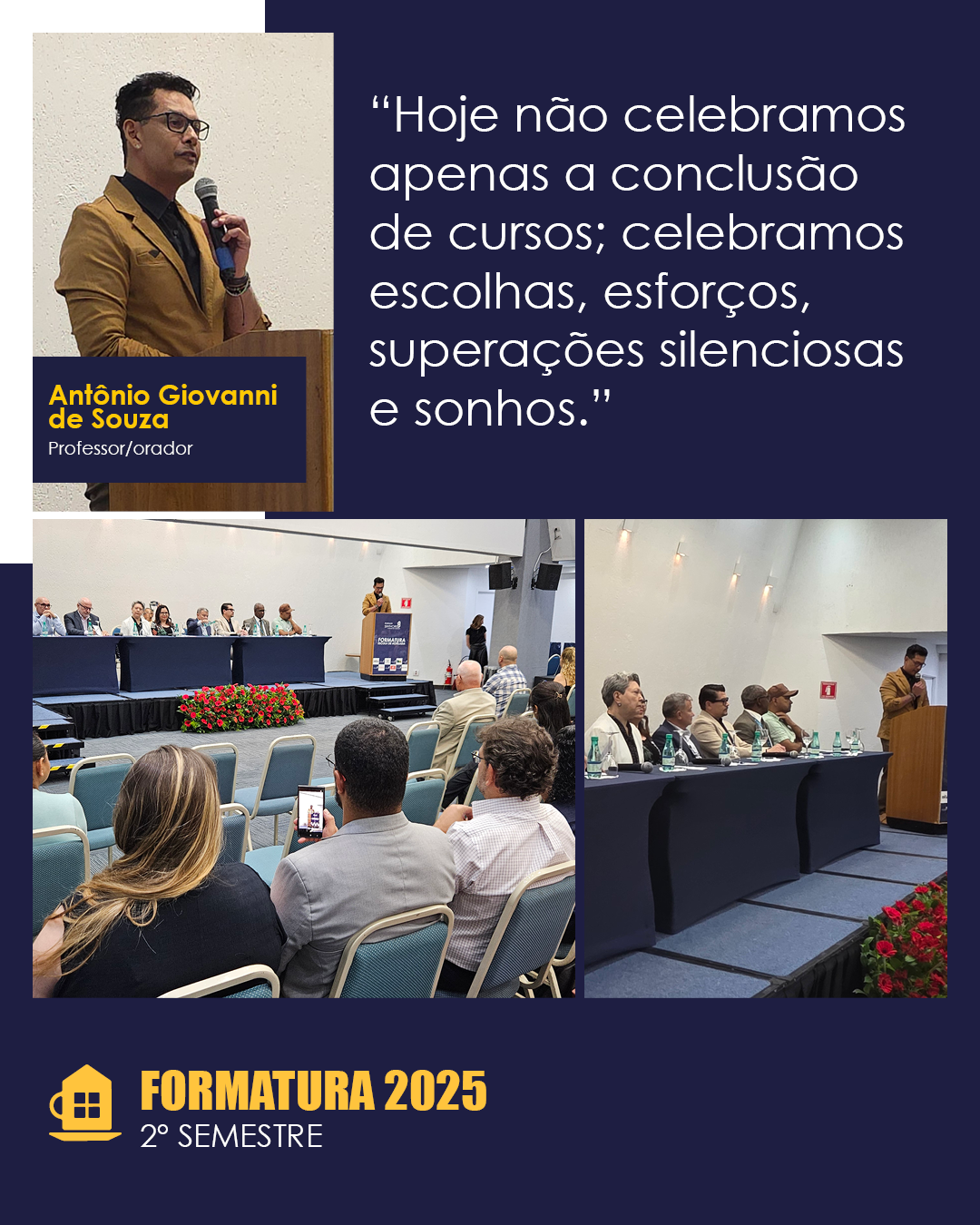 Representando o corpo docente, o professor Antônio Giovanni de Souza afirmou que a cerimônia marcou mais do que o encerramento das turmas. Segundo ele, o momento simboliza escolhas, esforços, superações e projetos de vida construídos a partir dos cursos.
