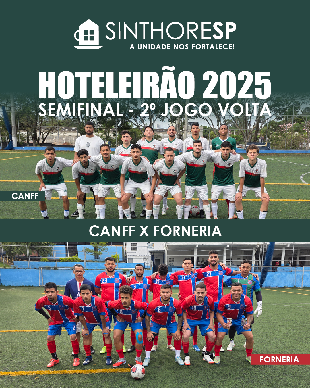 O Hoteleirão 2025, campeonato de futebol promovido pelo Sinthoresp, teve neste sábado, 18 de outubro de 2025, o 2º jogo de volta (e último) das semifinais no CDC Anhanguera. Em manhã de decisão, o CANFF superou a Forneria por 2 a 0 e confirmou a classificação para a grande final.