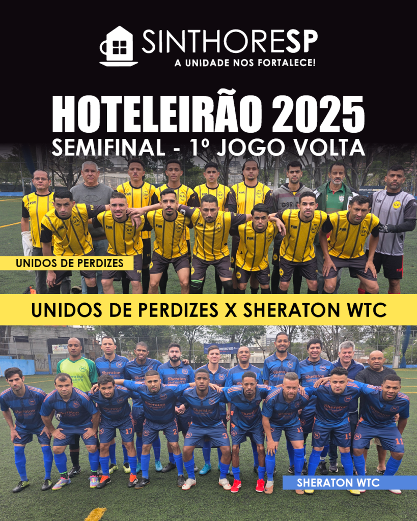 O Hoteleirão 2025, campeonato de futebol promovido pelo Sinthoresp, teve neste sábado, 11 de outubro de 2025, o 1º jogo de volta das semifinais, no CDC Anhanguera. Em partida equilibrada e muito disputada, Unidos de Perdizes e Sheraton WTC ficaram no 1 a 1.