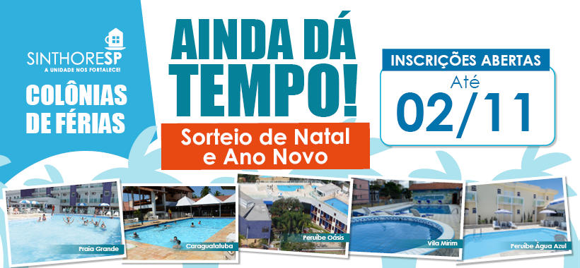 O Sinthoresp informa que continuam abertas, até 02 de novembro, domingo, as inscrições no site do Sinthoresp para o sorteio de hospedagens nas colônias nos períodos de Natal (23 a 25/12) e Ano Novo (30/12 a 01/01). A participação é exclusiva para associados em dia, e o sorteio será realizado em 04/11, com transmissão ao vivo no YouTube (TV Sinthoresp) e Facebook.